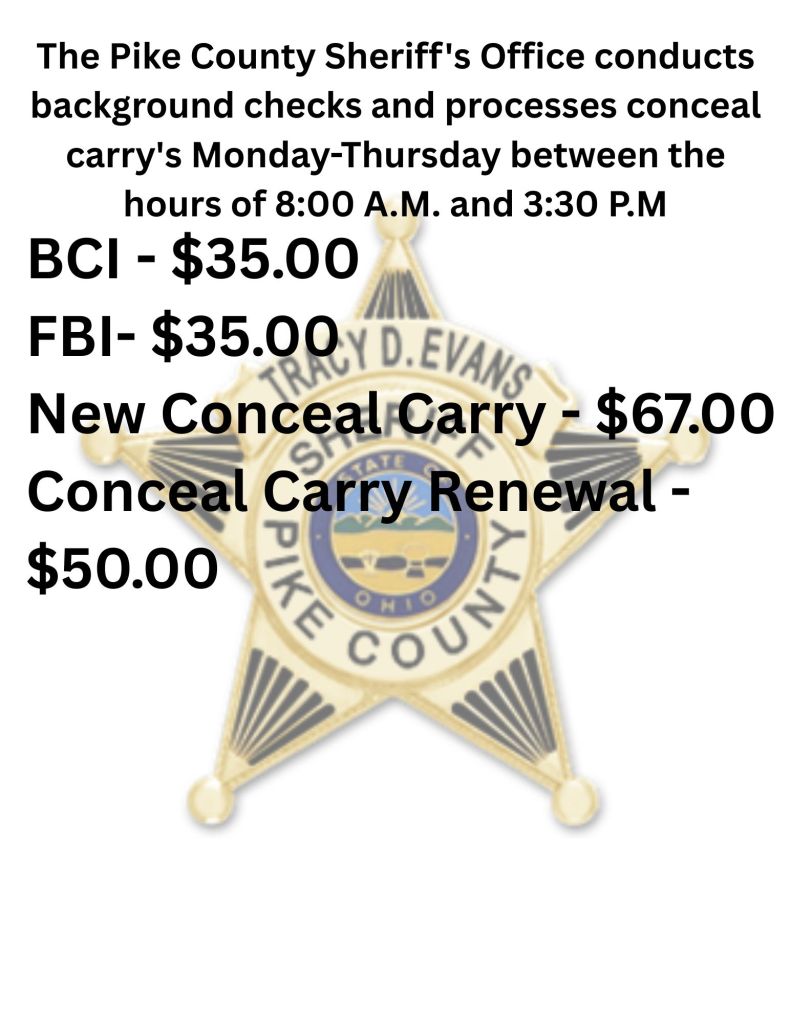 Beginning April 16, 2025 the Pike County Sheriff’s Office will only be accepting walk in’s for background checks and conceal carry’s monday-thursday from 8:00 A.M. to 3:30 P.m. We apologize for any inconvenience this may create.